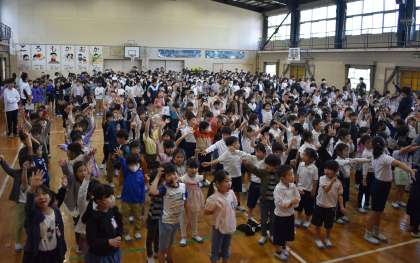 次に、体育委員会からの連絡を聞き、最後は、今月の歌「手のひらを太陽に」を明るく元気に歌いました。