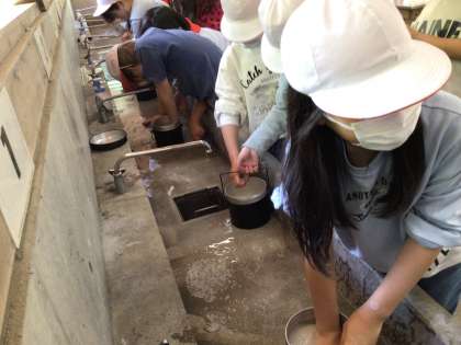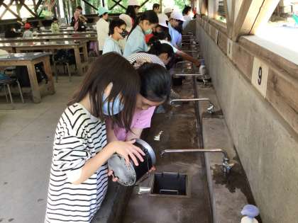 飯ごう炊飯の準備です。 水加減に気をつけて美味しいご飯を炊きます。