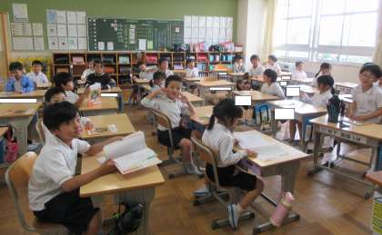 2年生の教室をのぞいたら、3時間目の道徳の授業のために机を移動し、静かにチャイムを待っていました。心の準備ができていました。