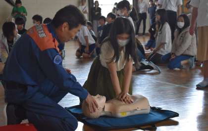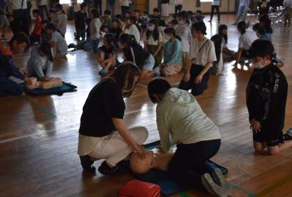 5年生は、応急手当講習を受けました。 実際に胸骨圧迫の体験をしました。