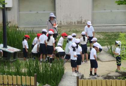2年生がわくわく池に集まって何やら話しています。