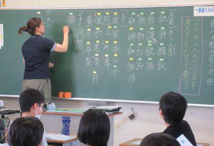 書写の授業では、つくりやへんのバランスを考えて書くために、部分の組み立て方について意見を出し合っていました。