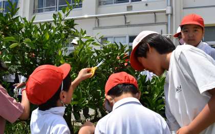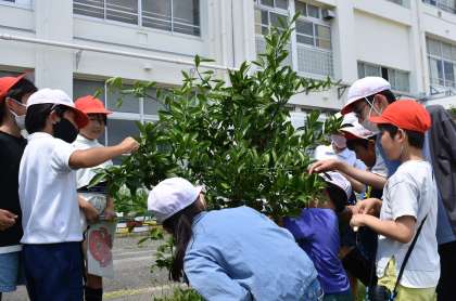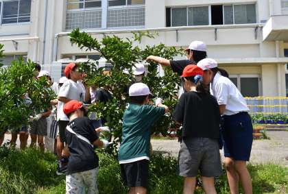 20葉に1果になるように、縦割り班で協力して摘果しました。