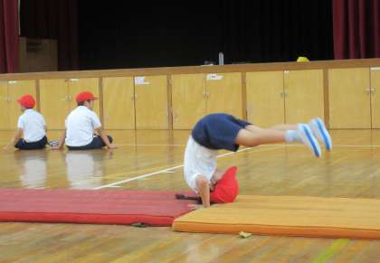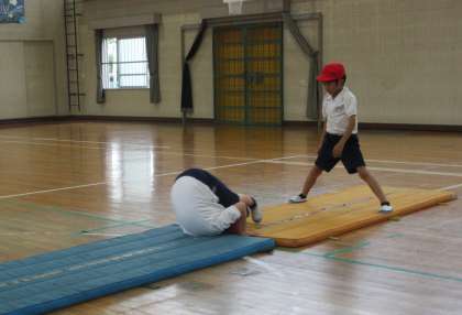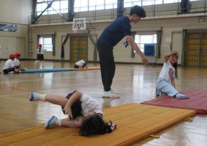 低学年はマット運動ではなく、遊びからいろいろな動きを体験していきます。
