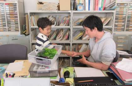 野菜がたくさん入ったかごを重そうに持ちながら、子供たちが職員室に来て採れたての野菜を販売しました。