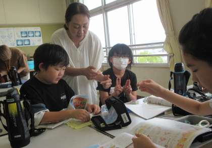 5年生は家庭科で裁縫用具を使って手縫いの練習をします。