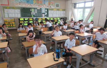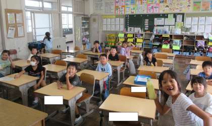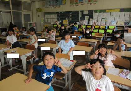 各教室を回っていたら、1年生がピカピカの笑顔で迎えてくれました。