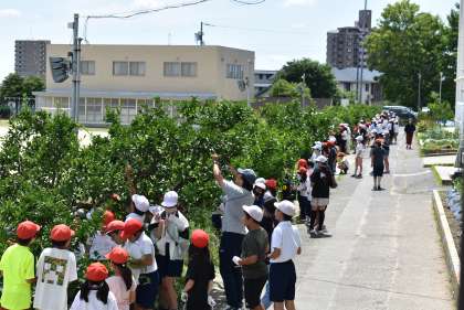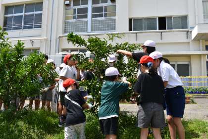 全校で縦割り班ごとに、みかんの実の摘果を行いました。