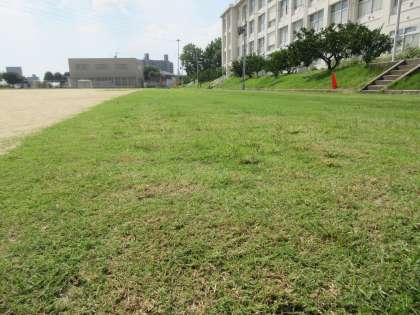 芝生については、校内整備員さんを中心に芝レンジャーの方にも手伝っていただき、水撒きや草刈りをしていただいたおかげで、青々とした芝生に成長しています。