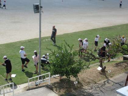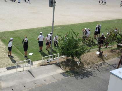 6年生は、理科「月と太陽」の学習で、遮光板使って太陽のおよその方位と高さを調べていました。
