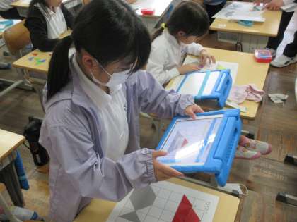 作った課題を学習用タブレットで撮影して提出し、みんなで話し合いをします。