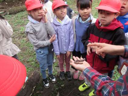 大きなミミズやオオスズメバチ(地面を歩いていたオス)等を発見して、生き物の生態について詳しく教えてもらいました。