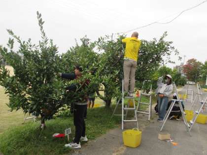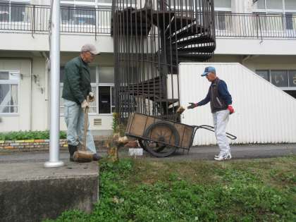 さて、収穫を終えたみかんの木や寿命を迎えたみかんの木がどのようになるのか気にしていたら、校内整備員さんと公務手さんが新しいみかんの木を植える準備をしていました。