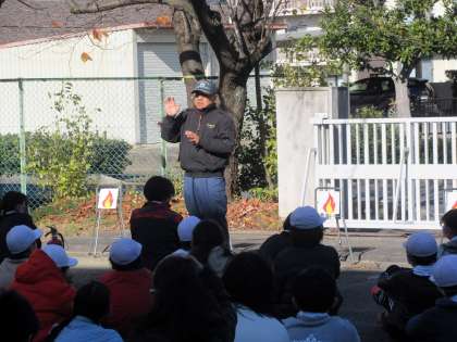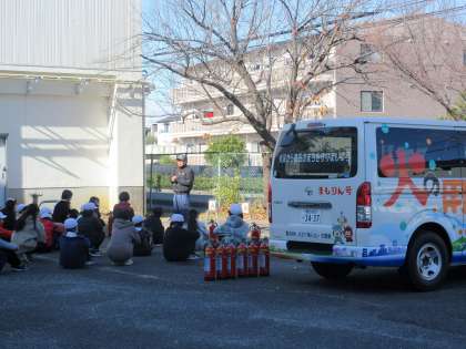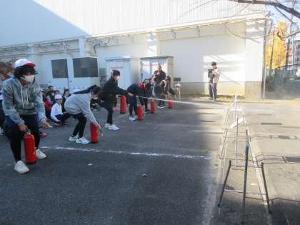 6年生は、消火器の使い方や注意を学び、水消火器を使って消火訓練を行いました。