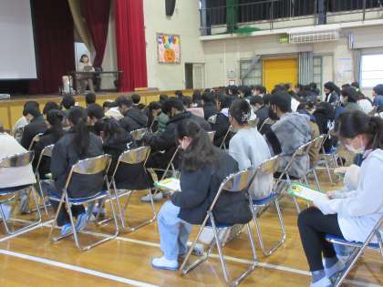 6年生は、「もしがんになったらどうなるだろう」、「がんになったらどうすればいいだろう」「家族や友達ががんになったら…」などを念頭に置きながら真剣に話を聞きました。