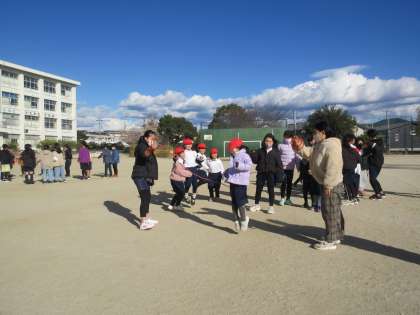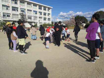 1年生と6年生が一緒に長縄跳びの練習をしていました。