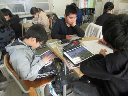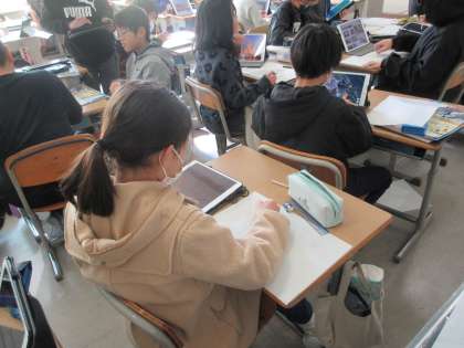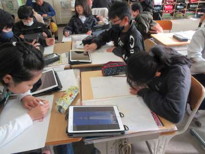 学習用タブレットを使って、スカイツリーや岐阜城、ピラミッドなどの画像を参考にしながら丁寧にかいていました。