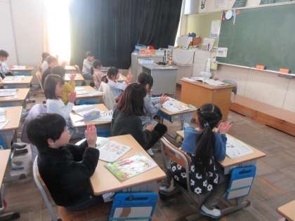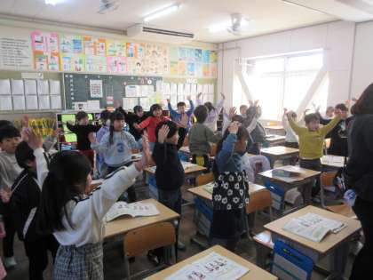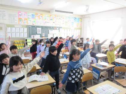 1年生の音楽の授業では、「とんくるりん ぱんくるりん」を身体表現を加えて楽しく活動していました。