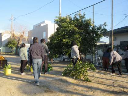運動場の南側のみかん(はっさく?)が落ち始めたので、下校後先生たちが収穫と枝の選定を行いました。