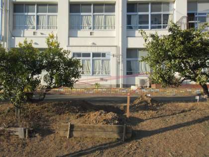 公務手さんと校内整備員さんが、みかんロードのみかんの苗の植え替えの準備を進めています。