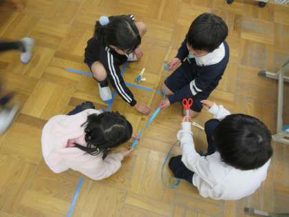 今日は1mの長さを紙テープで作り、身のまわりから1mの長さ探しをして量感を身につけていました。