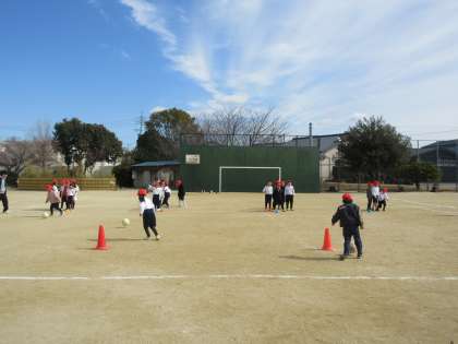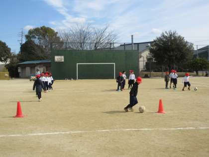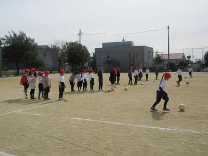 基本的な動きに慣れたら、ボールけりゲームへとつなげていきます。