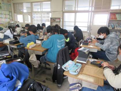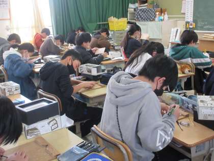 校歌のオルゴールの箱をデザインし、彫刻刀で彫って仕上げていきます。