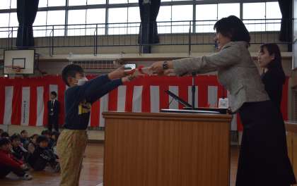 次に、1年間の学習面や生活面での頑張りを1年生から5年生みんなで認め合いました。