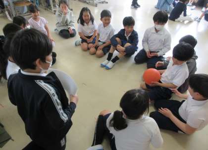 ボールをバトン代わりにしながら順番に自己紹介をしました。名前と好きなものを伝えました。