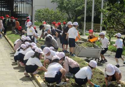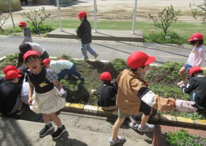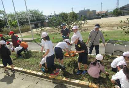 2年生は、生活科で夏野菜を育てる準備として学年園の草取りをしました。