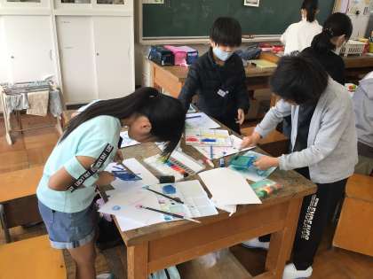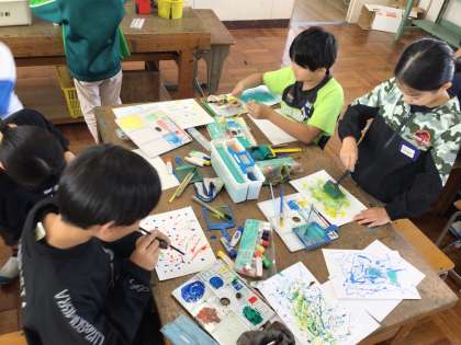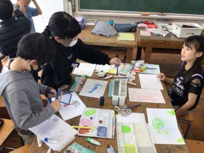 4年生の図工の授業では、絵の具+水+( )で、いろいろな模様づくりにチャレンジしていました。
