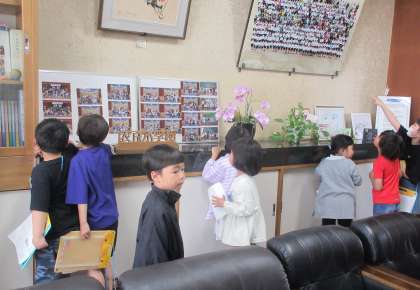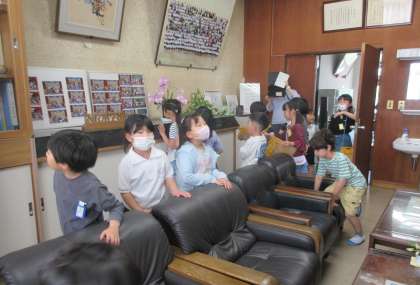 「校長室は、校長先生が仕事をする部屋です。パソコンや写真があります。」の説明の後、ほかの教室にはないものをたくさん見つけていました。