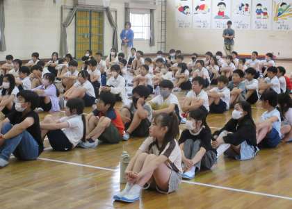 5年生は、体育館で野外学習(キャンプ)に向けての学年集会を開いていました。