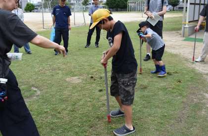 芝生を管理するために、豊田スタジアムの職員と地域の方や育友会の方、教職員で「芝レンジャー」を構成し、10年以上芝の維持管理に努めています。