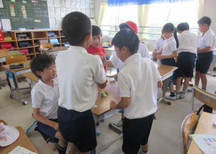 教室内では、担任の先生とおしゃべりをしたり消しゴムでバトルをして遊んだりする姿が見られました。