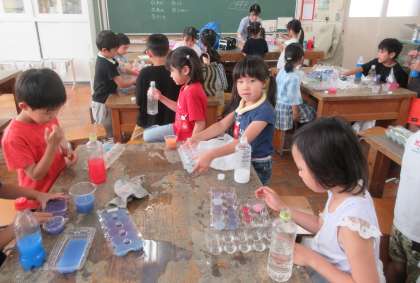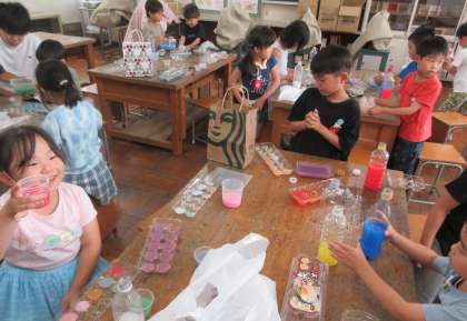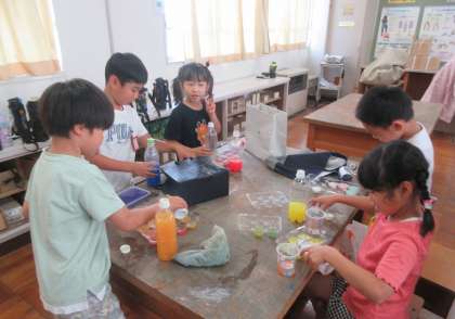 1年生が図画工作科「カラフルいろみず」で色水遊びを楽しんでいました。
