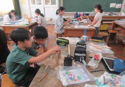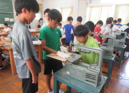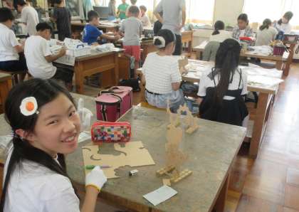 5年生は図画工作科「糸のこスイスイ」で、電動糸のこを使って作品作りをしていました。
