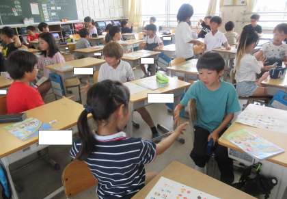 外国語活動では、色や果物やスポーツについて、自分の好きなものを伝えたり、友達に尋ねたりして活動しました。