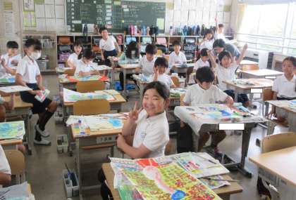 図画工作科では、読書感想画に取り組み、クジャクの美しさを表現できるように工夫していました。