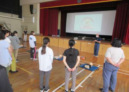 児童の下校後、豊田市消防本部の職員を講師に、救急蘇生法講習会を行いました。