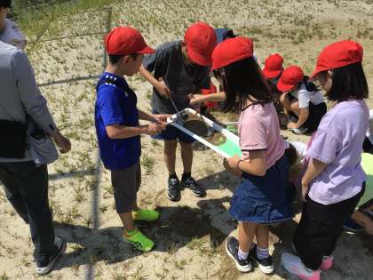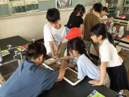 今日は、水はどのように流れ、地面にしみ込むのかを簡単な実験道具を作って観察しました。