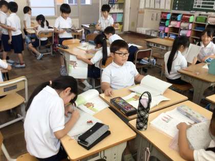 国語科では、「ニャーゴ」を音読した後、グループ内で感想の交流をしました。