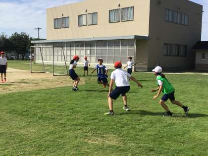 体育科では、体つくり運動で2チームに分かれて鬼ごっこをしていました。