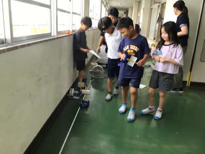 理科では風の力の働きを調べるために、風で動く車を作り廊下で実験をしていました。