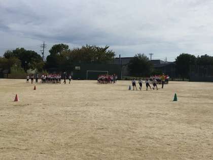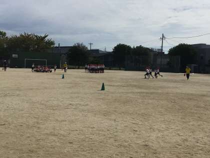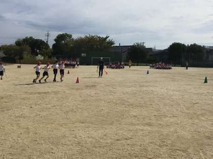 運動場で運動会種目「台風の目」の学年練習をしていました。