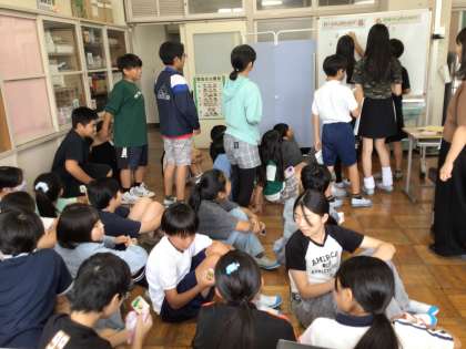 子どもたちは日常の生活用品を「防災グッズの中に必要なもの」「救急箱の中に必要なもの」「その他」の3つのグループに分け、防災グッズの中身などについて確認しました。