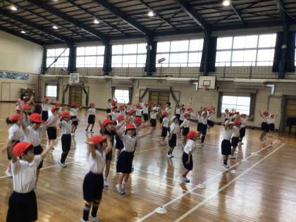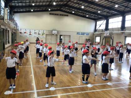 1年生は体育館で表現運動「勇気100%」の練習をしていました。