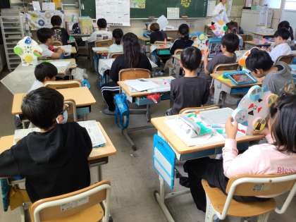 図画工作科では、割りピンを使った作品を作っていました。台紙がバランスよく立つように工夫していました。