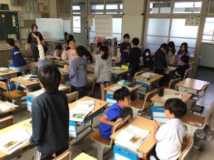 国語科では、「サーカスのライオン」の登場人物の気持ちについて考え、グループで意見を共有していました。