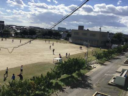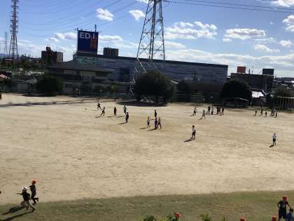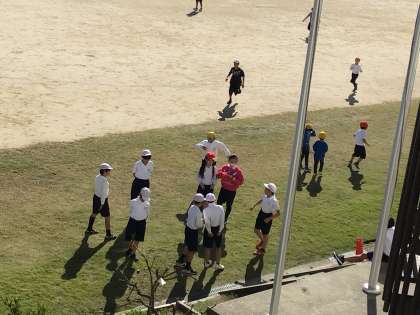 子どもたちは、爽やかな青空のもと、運動場で元気に走り回っていました。